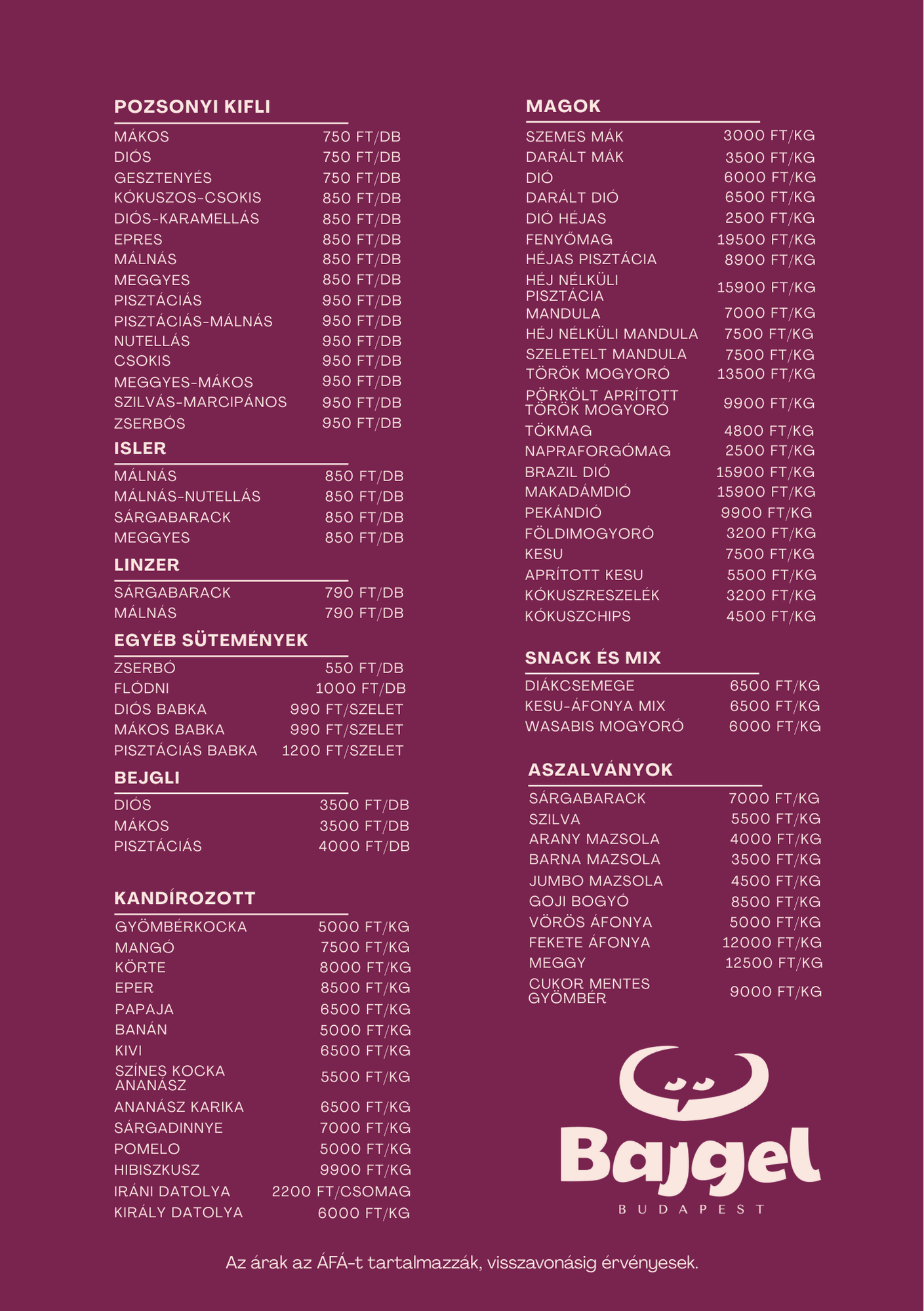 A Bajgel egy szeretettel működő kis vállalkozás, ahol a hagyomány és a minőség találkozik. Főként pozsonyi kifliket készítünk – klasszikus és különleges ízekben egyaránt –, hogy mindenki megtalálhassa a saját kedvencét. Kínálatunkat tovább gazdagítják a frissen sütött bejglik, házi sütemények, valamint a gondosan válogatott magvak, aszalt és kandírozott gyümölcsök.